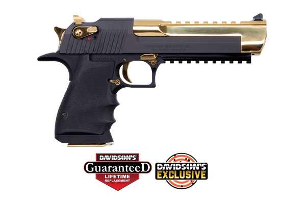Magnum Research MGR DE L6 MK XIX 50AE 6B GOLD: DE50BATG: 761226089094: Pistol: Semi-Auto: Desert Eagle: 50 AE: Single Action: 7+1: Black Aluminum Frame/ Gold Barrel: Black Hard Coat Alloy Frame/ Gold Appointments: Fixed Gold Plated Rear Sight: 6: 10.75: Full Weaver Style Accessory Rail