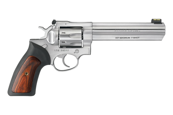 Ruger RUG GP100 357 DA REV 6SS 7RD: 1773: 736676017737: Revolver: Double Action: GP100: 357 MAG: Double Action: 7: Satin Stainless: Cushioned Rubber With Hardwood Insert: Front: Fiber Optic Rear: Adjustable: 6: 10.38: